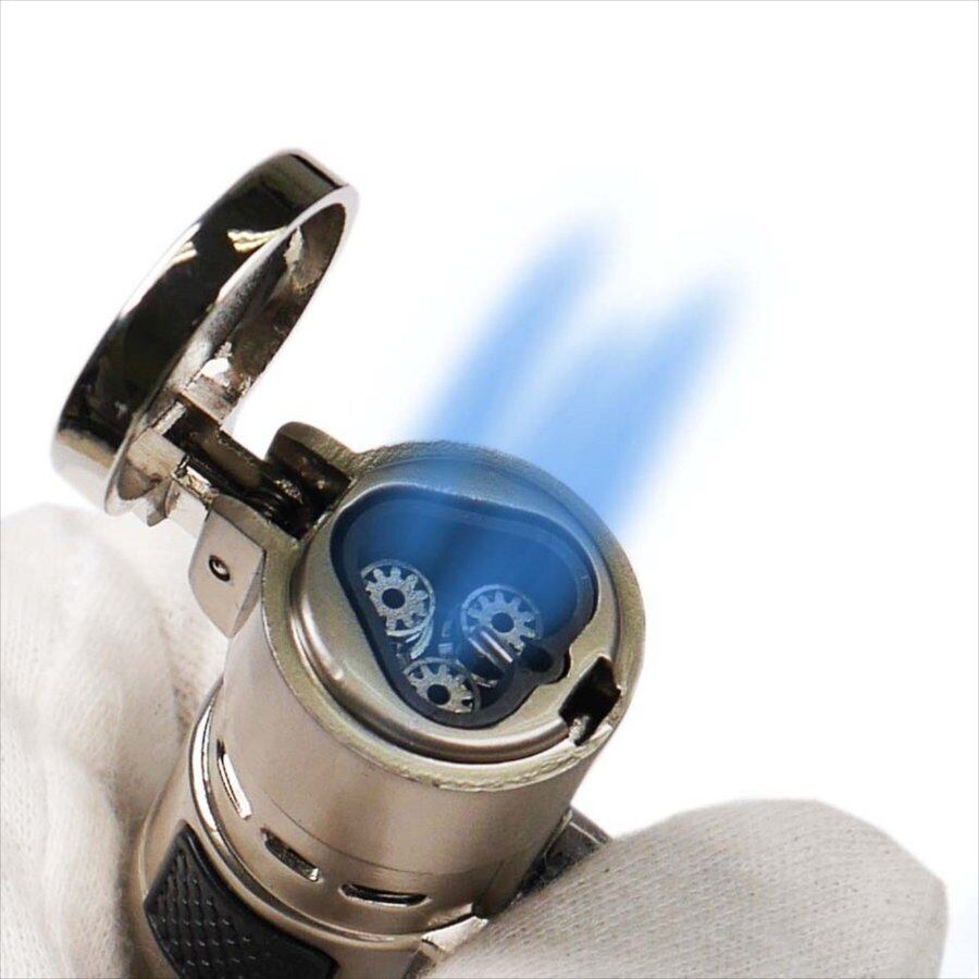 3本のパワフルなジェットバーナーが特長の強力ターボライターです。着火スイッチを押すと自動的に蓋が開きます。3本のパワフルな炎!大容量ガスタンクで長持ち! 着火作業で指先が熱くなりにくい!ツマミを廻して簡単に炎の調整可能。持ち運びにも便利なコンパクトサイズ。スケルトンボディーのガスタンクによりガスの残量が一目で分かります。高火力な実用性とガッチリした独自のデザインが人気のターボライターです。